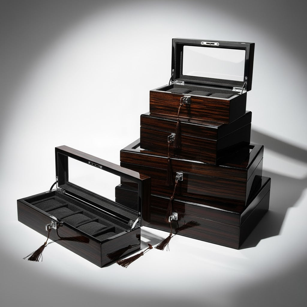 Chaque boîte LUXHOR est le fruit d’un savoir-faire exigeant, où la précision horlogère rencontre l’artisanat du bois. Poli à la main, vernis brillant et intérieur en velours profond : chaque détail est pensé pour magnifier vos garde-temps.